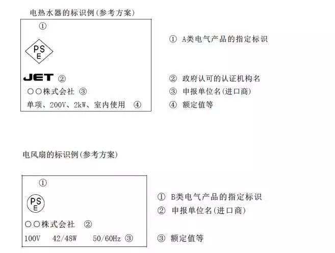 标志,检查机关 (如JET等) 的简称及日本进口商公司名,产品额定值等内容。