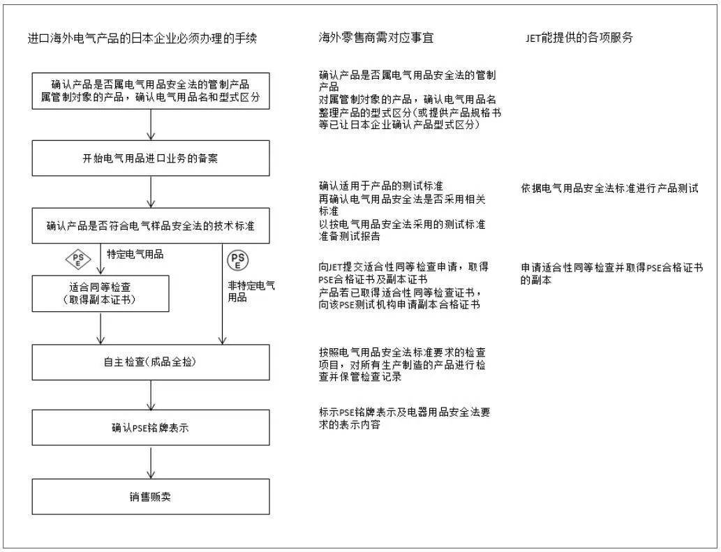 ,法规没有规定必须在JET等日本经济产业省指定的测试机关接受PSE测试, 但法规要求日本企业进口的海外电气产品必须符合电气用品安全法的技术标准,海外制造商必须证明自己公司的产品符合技术标准要求。如果产品还需要进行相关PSE测试及取得测试数据,可以向JET申请委托测试。