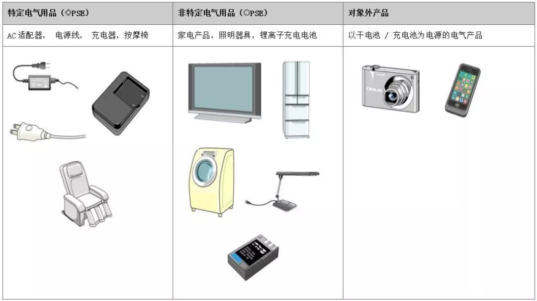 电气用品一般是指与AC100V或AC200V的插座,屋内配线连接使用的电气产品,以及电源插头,电线等部品,锂离子充电电池等。使用AC电源适配器才能运作的电气产品,其AC电源适配器及电源线有可能属于电气用品安全法的管制对象产品,而与适配器相连接的电气产品则不属于电气用品安全法的管制对象。 另外,内装蓄电池的充电式产品,其充电器,充电器的电源线,锂离子充电电池,也有可能属于电气用品安全法的管制对象产品,充电式产品本身则不属电气用品安全法管制对象。